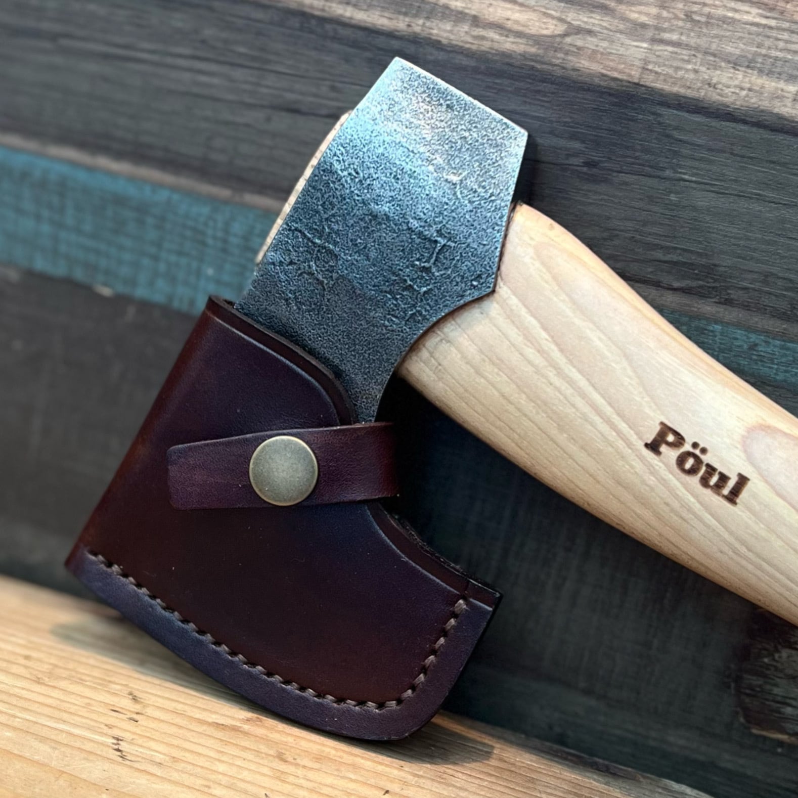 刃は炭素鋼でできており、さまざまな環境下で使用できる非常に丈夫で耐久性のある素材です。柄はヒッコリー材を使用しており、湿った森林に強い木材です。刃先は、木や丸太を割るだけでなく、木片を削る細かな作業にも適しています。刃の裏側はハンマーとして多機能に使用できます。