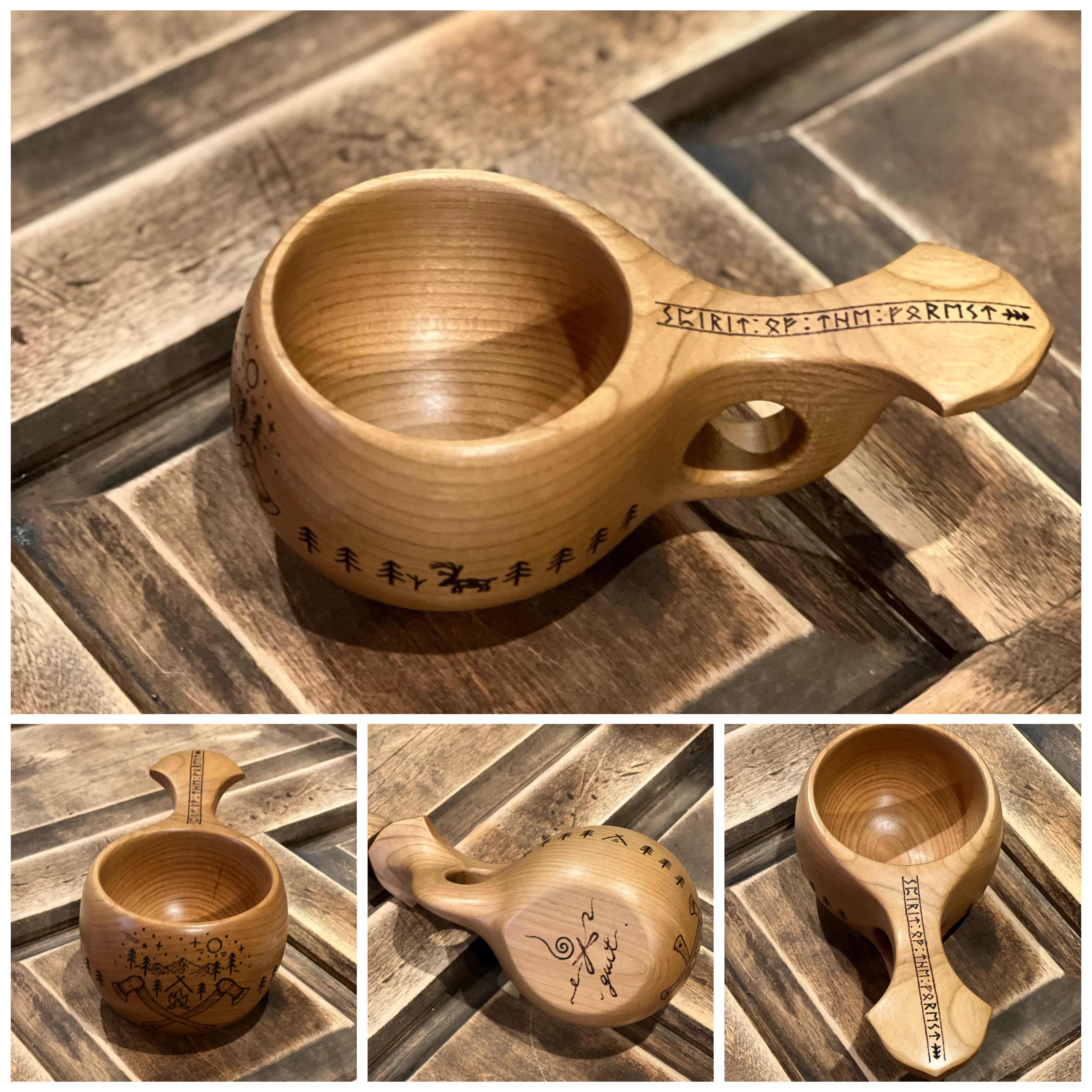 今回入荷したのはウッドバーニングが美しいククサです!山桜は使い込めば味のでるとても美しい木です♪