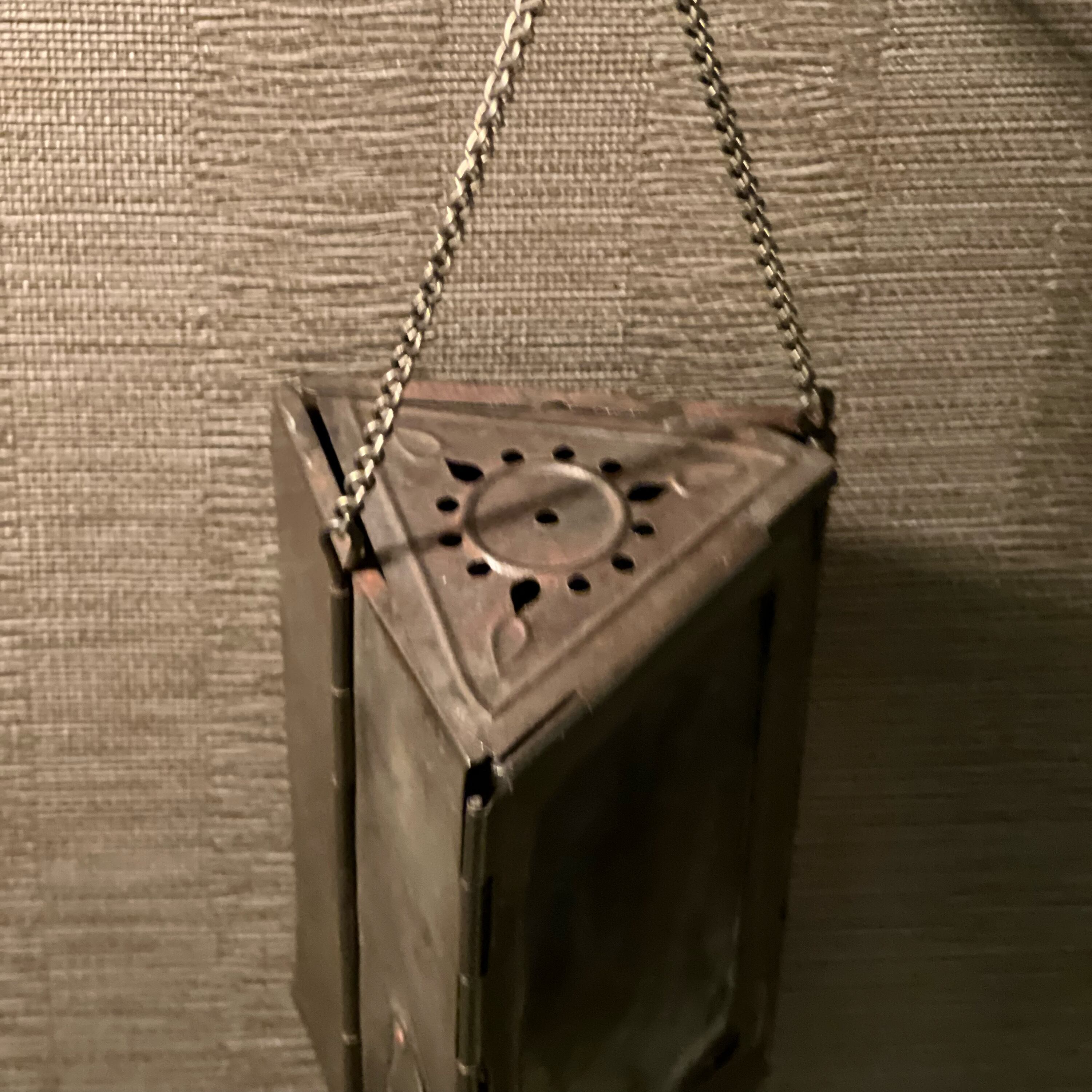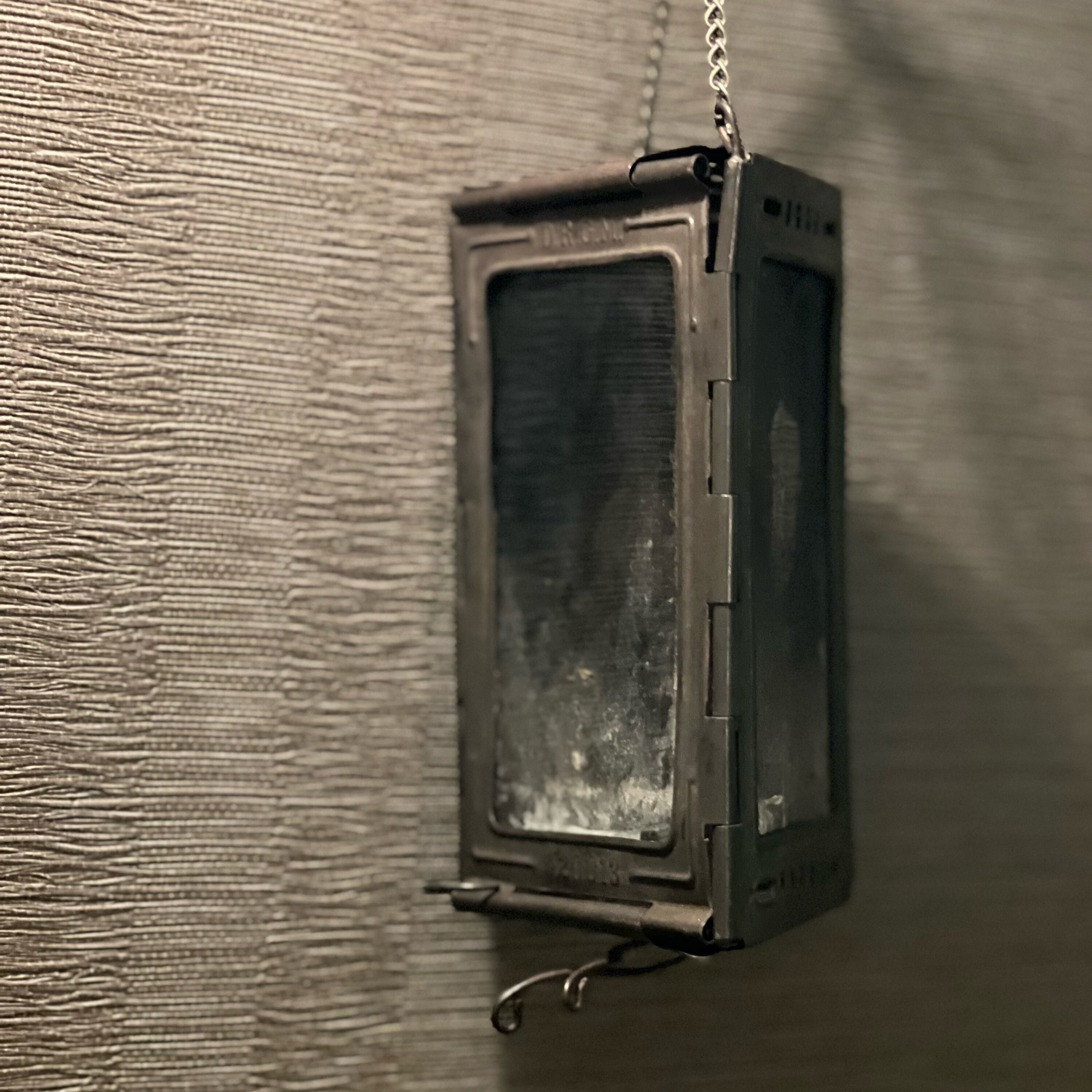 こちらのキャンドルランタンは1枚がガラスに交換されています。傷や表面剥離・汚れが多数あります。